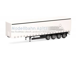 Mit dem bekannten vierachsigen Chassis und seitlichem Unterfahrschutz ergänzt der bekannte Gardinenplanen-Auflieger das Herpa-Programm in weißer Farbgebung. |