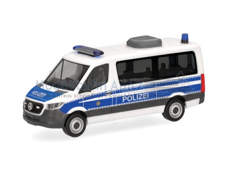 Bei der Bundespolizei in Deutschland erfreut sich der Mercedes-Benz Sprinter als Mannschaftstransporter großer Beliebtheit. Herpa setzt das Modell mit auf dem Dach montierter Klimaanlage, einem Warnlichtbalken vorne und einem Rundumlicht heckseitig um. |