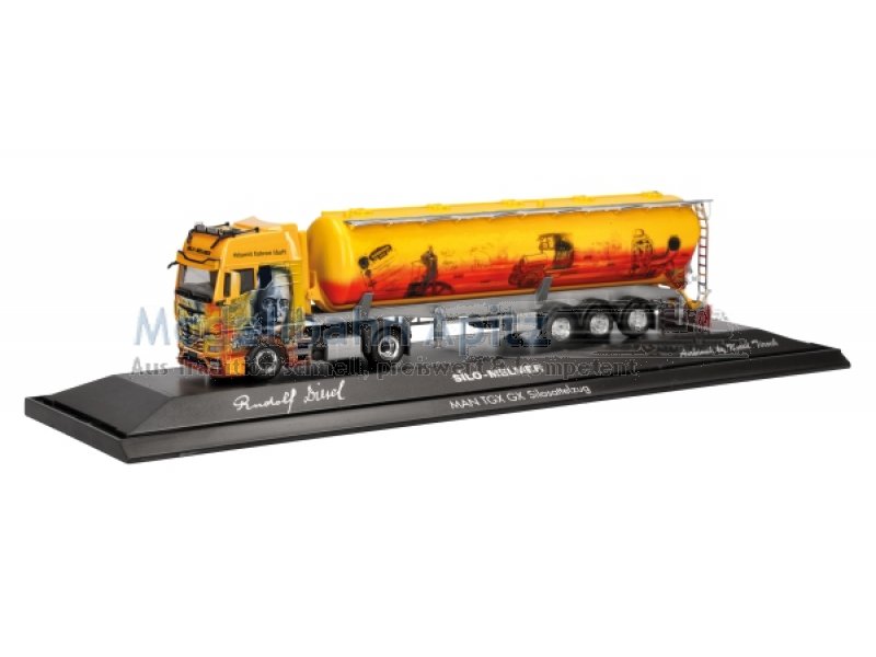 Mit neuer Zugmaschine, einer aktuellen MAN TGX GX, ist der bekannte Siloauflieger Rudolf Diesel auf den Straßen Europas unterwegs. Herpa setzt die neue Zugmaschine in Kombination mit dem bekannten Auflieger in einmaliger Auflage als Private-Collection-Modell um. |