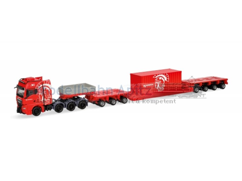 Ihren Hauptsitz hat das Unternehmen De Romein in Veendam in den Niederlanden, unterhält aber auch eine Niederlassung in Niedersachsen. Neu im Fuhrpark sind drei neue MAN TGX GXC Schwerlast-Zugmaschinen, von denen ein Miniaturmodell mit Tieflade-Auflieger und einem 20 ft. Container von Herpa in einmaliger Auflage gefertigt wird. |