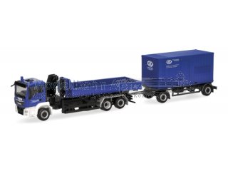 Das THW in Singen in Baden-Württemberg setzt diesen MAN TGS M Wechsellader-LKW mit flacher Mulde und Ladekran ein, der einen Anhänger beladen mit einem 20 ft. Stromaggregat zum Einsatzort zieht. Das Herpa-Modell wird in einmaliger Auflage produziert. |