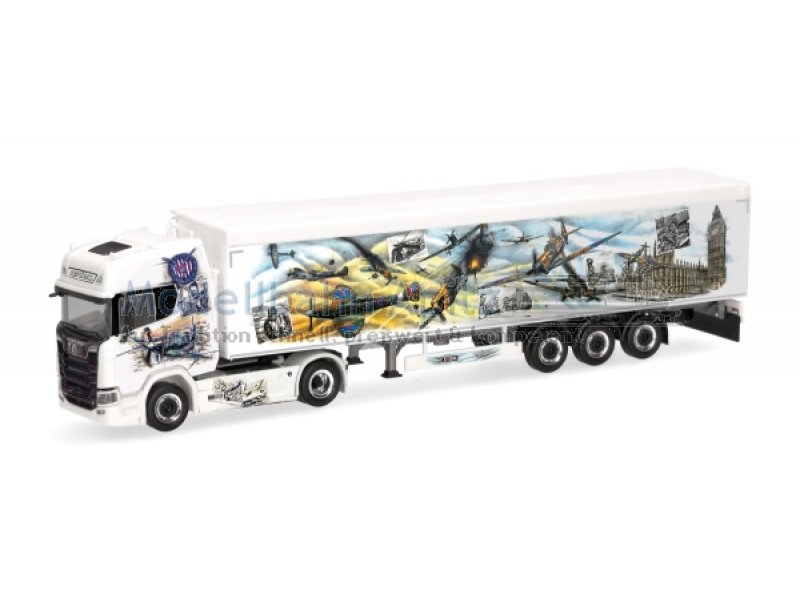 Für seine ansprechend gestalteten Fahrzeuge ist die in Polen beheimatete Spedition Repinski bekannt. Unter dem Titel Squadron 303 wurde dieser aktuelle Scania CS 20 mit Schubboden-Auflieger gestaltet und erscheint bei Herpa in einmaliger Auflage. |