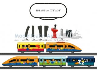 Züge und die Maus bringen Kinderaugen zum Leuchten. Das kann nun auch im Kinderzimmer passieren, denn die Märklin my world Startpackung “Mauszugö enthält einen 5-teiligen Hochgeschwindigkeitszug mit 63 cm Länge, der mit seinem schnittigen Design und den kindlich, ansprechenden Maus-Motiven, über die selbst zusammengesteckte Strecke rast. Die schöne Gestaltung kann per Sticker angebracht werden und wird Fan-Herzen höherschlagen lassen. Die verschiedenen Weichen bieten noch mehr Spielraum beim Zusammenbau. Stück für Stück entstehen großartige Streckenverläufe durch das Spielzimmer, die sich mit Sets separat erhältlicher Kunststoffgleise noch erweitern lassen. Das Zusammensetzen der einzelnen Teile hilft dabei, die motorischen Fähigkeiten und das Verstehen von Zusammenhängen zu schulen.Volle Kontrolle mit dem Märklin Power Control StickDer kabellose Märklin Power Control Stick kann von Kindern mit nur einer Hand bedient werden. Damit lässt sich der Zug vorwärts und rückwärts in jeweils drei Geschwindigkeitsstufen fahren. Außerdem kann der Zug auf Knopfdruck am Control Stick verschiedene Soundeffekte abspielen und sein Zweilicht-Spitzensignal anschalten.Sicheres Spielen mit MärklinDamit auch schon die Kleinsten mit dem Modellzug von Märklin spielen können, steht Sicherheit an oberster Stelle. Die einzelnen Abteile der Züge sind über sichere Magnetkupplungen miteinander verbunden, die keine kleinen Einzelteile haben und einfach zu bedienen sind. Der motorisierte Triebkopf mit wiederaufladbarem Akku ist kindersicher gestaltet und daher das perfekte Spielzeug für den Einstieg in die Modellzugwelt ab 3 Jahren. Der Akku mit passendem Ladekabel und die Batterien für den Power Control Stick (2x AAA-Batterien) sind im Lieferumfang enthalten, sodass der Spielspaß direkt losgehen kann. Die einzelnen Schienenteile lassen sich ganz einfach zusammenstecken und alle Teile des Spielsets sind besonders robust gestaltet. Somit ist das Spielset perfekt für große und kleine Fans von Zügen und Modelleisenbahnen geeignet.
