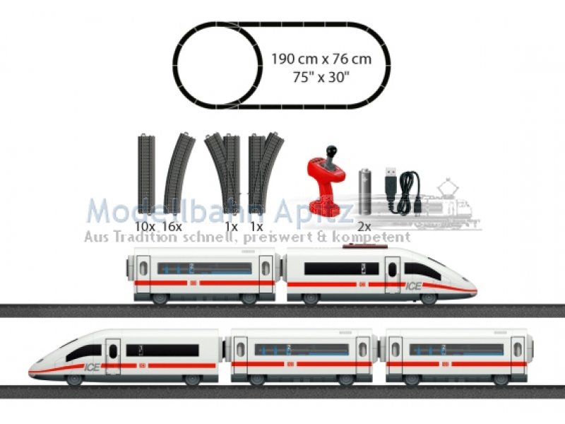 Großes VorbildBahnhöfe und das Einfahren von Zügen bringen Kinderaugen zum Leuchten. Das kann nun auch im Kinderzimmer passieren, denn die Märklin my world Startpackung “ICE 3ö enthält einen 5-teiligen Hochgeschwindigkeitszug mit 63 cm Länge, der mit seinem schnittigen Design über die selbst zusammengesteckte Strecke rast. Die abnehmbaren Dächer der drei Zwischenwagen sorgen für viele Spielmöglichkeiten. Die detailreiche Gestaltung des Schnellzugs orientiert sich am Original und wird Fan-Herzen höherschlagen lassen. Die verschiedenen Weichen bieten noch mehr Spielraum beim Zusammenbau. Stück für Stück entstehen großartige Streckenverläufe durch das Spielzimmer, die sich mit Sets separat erhältlicher Kunststoffgleise noch erweitern lassen. Das Zusammensetzen der einzelnen Teile hilft dabei, die motorischen Fähigkeiten und das Verstehen von Zusammenhängen zu schulen.Volle Kontrolle mit dem Märklin Power Control StickDer kabellose Märklin Power Control Stick kann von Kindern mit nur einer Hand bedient werden. Damit lässt sich der Zug vorwärts und rückwärts in jeweils drei Geschwindigkeitsstufen fahren. Außerdem kann der Zug auf Knopfdruck am Control Stick verschiedene Soundeffekte abspielen und sein Zweilicht-Spitzensignal anschalten.Sicheres Spielen mit MärklinDamit auch schon die Kleinsten mit dem Modellzug von Märklin spielen können, steht Sicherheit an oberster Stelle. Die einzelnen Abteile der Züge sind über sichere Magnetkupplungen miteinander verbunden, die keine kleinen Einzelteile haben und einfach zu bedienen sind. Der motorisierte Triebkopf mit wiederaufladbarem Akku ist kindersicher gestaltet und daher das perfekte Spielzeug für den Einstieg in die Modellzugwelt ab 3 Jahren. Der Akku mit passendem Ladekabel und die Batterien für den Power Control Stick (2x AAA-Batterien) sind im Lieferumfang enthalten, sodass der Spielspaß direkt losgehen kann. Die einzelnen Schienenteile lassen sich ganz einfach zusammenstecken und alle Teile des Spielsets sind besonders robust gestaltet. Somit ist das Spielset perfekt für große und kleine Fans von Zügen und Modelleisenbahnen geeignet.