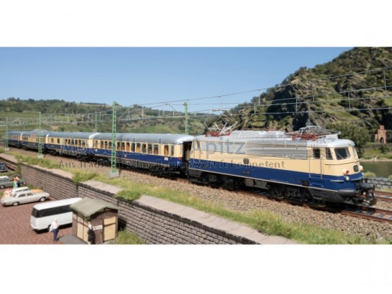 Vorbild: Elektrolokomotive Baureihe E10.12 Bügelfalte der Deutschen Bundesbahn (DB). Kobaltblau/beige Grundfarbgebung, als Rheingold-Lokomotive. Ausführung mit 5 Stirnlampen, durchgehendem Lüfterband mit abgerundeten Enden, umlaufender Regenrinne sowie Pufferverkleidung und Schürze. Lok-Betriebsnummer E10 1265. Betriebszustand um 1962/63.