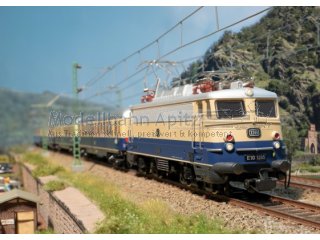 Vorbild: Elektrolokomotive Baureihe E10.12 Bügelfalte der Deutschen Bundesbahn (DB). Kobaltblau/beige Grundfarbgebung, als Rheingold-Lokomotive. Ausführung mit 5 Stirnlampen, durchgehendem Lüfterband mit abgerundeten Enden, umlaufender Regenrinne sowie Pufferverkleidung und Schürze. Lok-Betriebsnummer E10 1265. Betriebszustand um 1962/63.