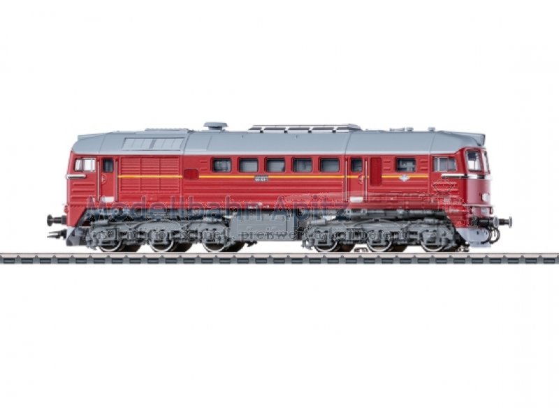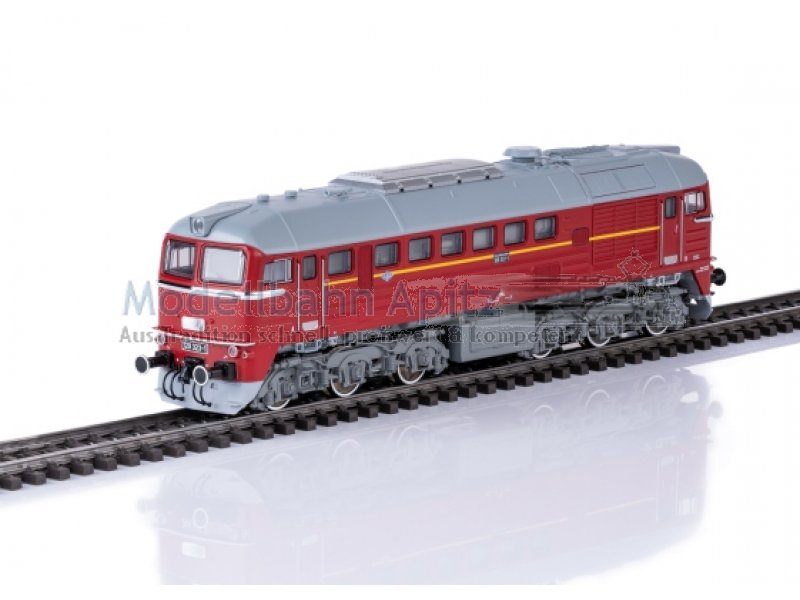 Vorbild: Diesellokomotive BR 120 der Deutschen Reichsbahn (DR), auch bekannt unter dem Spitznamen äTaigatrommel“. Ausführung mit Schalldämpfer sowjetischer Bauart. Betriebszustand 1973. Betriebsnummer 120 323-1. Modell: Mit Digital-Decoder mfx+ und umfangreichen Geräuschfunktionen. Geregelter Hochleistungsantrieb zentral eingebaut. Jeweils zwei Achsen in jedem Drehgestell über Kardan angetrieben. Haftreifen. Fahrtrichtungsabhängig wechselndes Dreilicht-Spitzensignal und 2 rote Schlusslichter konventionell in Betrieb, digital schaltbar. Spitzensignal an Lokseite 2 und 1 jeweils separat digital abschaltbar. Wenn Spitzensignal an beiden Lokseiten abgeschaltet ist, dann beidseitig Funktion des Doppel-A-Lichts. Führerstandbeleuchtung mit der Fahrtrichtung wechselnd, digital schaltbar. Maschinenraumbeleuchtung digital schaltbar. Beleuchtung mit wartungsfreien warmweißen und roten Leuchtdioden (LED). Seitlich angesetzte Griffstangen aus Metall. Frontschürze gegen geschlossene Frontschürzen austauschbar. Länge über Puffer ca. 20,2 cm.