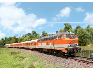 Vorbild: Diesellokomotive Baureihe 218 der Deutschen Bundesbahn. Reinorange/Kieselgraue Grundfarbgebung. Betriebsnummer 218 140-2. Betriebszustand ab 1985.