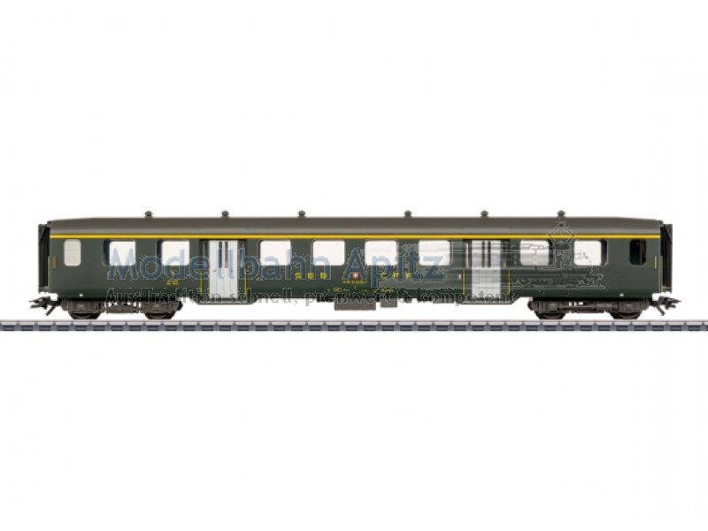 Vorbild: Leichtstahlwagen 1. Klasse der Schweizerischen Bundesbahnen (SBB CFF FFS) mit vierflügeligen Türen und zwei Einstiegen je Seite. Farbgebung Tannengrün. Betriebszustand um 1990. Modell: Wagen in tannengrüner Farbgebung und mit Faltenbalg-Ausrüstung entsprechend der Ursprungs-Ausführung. Vorbereitet für Strom führende Kupplungsdeichseln 7319 oder Strom führende trennbare Kurzkupplungen 72020/72021 und Innenbeleuchtung 73400/73401 oder 73410/73411.Länge über Puffer ca. 26,0 cm.Gleichstromradsatz E700580.