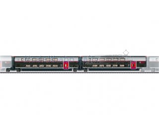 Vorbild: Hochgeschwindigkeitszug TGV INOUI (Euroduplex). Premium-Angebot der Französischen Staatsbahnen (SNCF), mit mehr Komfort und Service, wie z.B. WLAN. Ausführung für den Verkehr zwischen Paris und München. 1 Doppelstock-Mittelwagen (R6) 2. Klasse und 1 Doppelstock-Mittelwagen (R7) 2. Klasse. Triebzugnummer 4713. Aktueller Betriebszustand 2025. Modell: 2-teiliges Ergänzungswagen-Set zur Erweiterung des Hochgeschwindigkeitszuges TGV INOUI, Artikel 37798, auf eine 10-teilige Einheit. Serienmäßig eingebaute Innenbeleuchtung mit wartungsfreien warmweißen Leuchtdioden (LED). Innenbeleuchtung wird versorgt über die durchgehende elektrische Verbindung des ganzen Zuges. Beide Mittelwagen sind fest miteinander gekuppelt. Kulissenführung in den Jakobs-Drehgestellen. Maßstäbliche Nachbildung, daher befahrbarer Gleisbogen ab Mindestradius 360 mm bei freiem Lichtraum. Länge des Wagenpaares 43 cm.