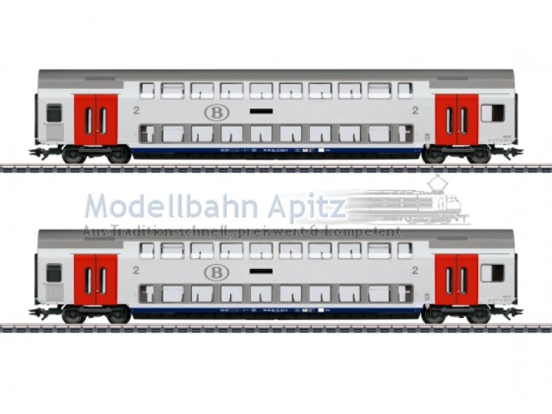 Vorbild: Zwei Doppelstockwagen Bauart M6, 2. Klasse, der SNCB. Lichtgraue Grundfarbgebung. Betriebszustand ab 2023. Modell: Befahrbarer Mindestradius 360 mm. Vorbereitet für den Einbau der Innenbeleuchtung 73141 sowie stromführender Kurzkupplungen 72020/72021. Beide Wagen einzeln verpackt in zusätzlicher Umverpackung. Länge über Puffer ca. 53,6 cm.Gleichstromradsatz E700580. Trix-Express-Radsatz E258259.