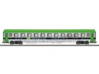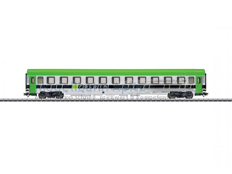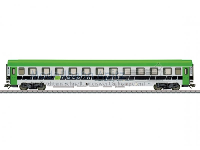 Vorbild: Begleitwagen, bzw. Reisezugwagen Bcm der Ralpin AG Olten. Betriebszustand ab Ende 2011. Modell: Auf Basis eines Reisezugwagens 2. Klasse Bauart Bmz. Befahrbarer Mindestradius 360 mm. Typspezifisch gestalteter Unterboden. Fiat Drehgestelle Y0270 S mit Schlingerdämpfer und mit Magnetschienenbremse. Vorbereitet für Strom führende Kupplung 7319 oder Strom führende Kurzkupplung 72021, Innenbeleuchtung E73400/73401, Schleifer 73406 und Zugschlussbeleuchtung 73407. Länge über Puffer ca. 28,2 cm. Gleichstromradsatz E700580. |
