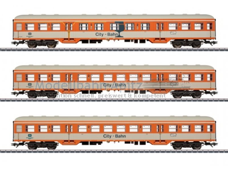 Vorbild: Set bestehend aus drei Personenwagen unterschiedlicher Bauarten der Deutschen Bundesbahn. Zwei Wagen der Bauart Bnrzb 778.1, 2. Klasse und ein Wagen der Bauart ABnrzb 772.2, 1./2. Klasse mit Cafeteria-Abteil. Zuglauf: Köln-Gummersbach. Reinorange/Kieselgraue Grundfarbgebung. Betriebszustand ab 1986. Modell: Typspezifisch gestaltete Unterböden. Drehgestelle mit Scheibenbremse. Separat angesetzte Griffstangen an den Wagenenden. Alle Wagen mit serienmäßig eingebauter LED-Innenbeleuchtung. In jedem Wagen ist ein Pufferkondensator zur Überbrückung von kurzfristigen stromlosen Stellen eingebaut. Ausgestattet mit trennbaren, stromführenden Kurzkupplungen. Die Innenbeleuchtung funktioniert im Verbund mit dem Steuerwagen 43833. Aufgedruckte Wagenlaufschilder. WC-Fallrohre und Rangiertritte liegen als separat ansteckbare Teile bei. Befahrbarer Mindestradius 360 mm. Alle Wagen einzeln verpackt in zusätzlicher Umverpackung. Länge über Puffer je Wagen 28,2 cm.
