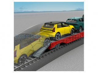 Modell: Wagen mit Magnetkupplungen. Der Wagen verfügt über eine klappbare Auffahrrampe an einem Wagenende. Die abnehmbaren, kindgerechten PKW-Modelle sind überwiegend aus Metall gefertigt.Gesamtlänge des Wagens 18,5 cm.