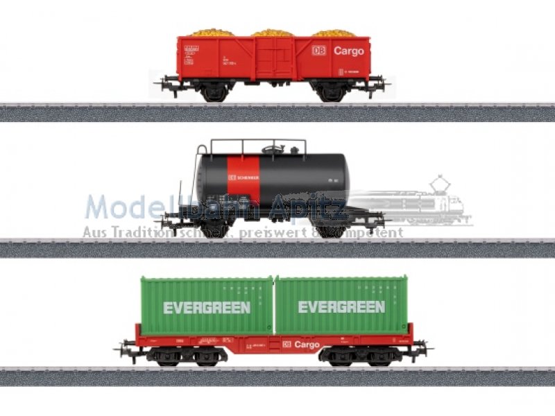 Vorbild: Offener Güterwagen, Kesselwagen und Containerwagen in einer fiktiven, verkehrsroten DB Cargo Farbgebung. Modell: Offener Güterwagen mit Ladungseinsatz Sand. Kesselwagen mit Bremserbühne. Containertragwagen mit zwei 20 ft. Containern beladen. Die kindgerechten Container können geöffnet werden. Alle Wagen mit Relexkupplungen.Gesamtlänge über Puffer 39,0 cm.Gleichstromradsatz E700580.