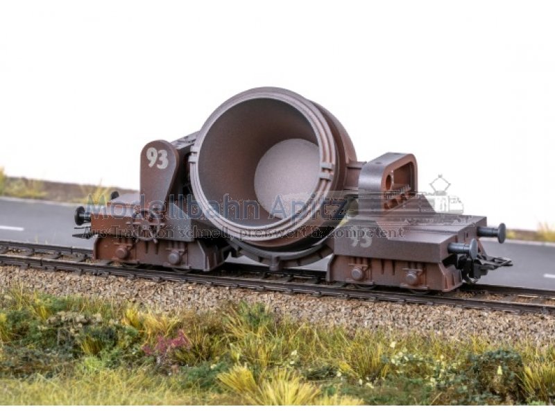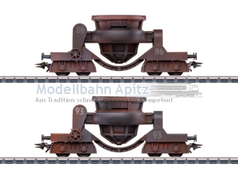 Vorbild: Zwei Spezialwagen zum Transport von Schlacke. Privatwagen nach Vorbild aus der Stahlindustrie. Kupferbraune Grundfarbgebung. Betriebszustand ab Mitte der 1950er-Jahre. Modell: Rahmen aus Metall. Pfanne seitlich kipp- und abnehmbar. Farbgebung mit authentischen Betriebsspuren. Beide Wagen einzeln verpackt in zusätzlicher Umverpackung. Länge über Puffer je Wagen 10,8 cm.