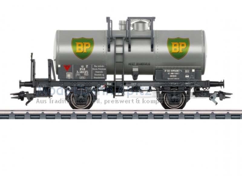 Vorbild: Kesselwagen mit zwei Radsätzen der British Petroleum (BP) Denmark, eingestellt bei den dänischen Staatsbahnen (DSB). Ausführung mit einem genieteten Kessel. Mit Bremserbühne, ohne Bremserhaus. Betriebszustand 1954. Modell: Detailliertes Fahrgestell mit durchbrochenem Rahmen. Detailliert nachgebildete und separat angesetzte Handbremskurbel, Bremsanlage und Entleerungsrohre. Angesetzte Arbeitsbühne mit Aufstieg. Angesetzte Bremserbühne, ohne Bremserhaus. Mit kulissengeführten Kurzkupplungen.Länge über Puffer ca. 10,1 cm. Gleichstromradsatz E700580.