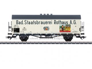 Vorbild: Privater Bierkühlwagen Bauart Tnoms 35 in fiktiver Gestaltung der Badischen Staatsbrauerei Rothaus A. G., eingestellt bei der Deutschen Bundesbahn (DB). Gestaltung mit äTannenzäpfle vom Hochschwarzwald“ Werbeaufschrift. Mit glatten Wänden aus Wagenbauplatten und mit stirnseitigen Eisluken und Bedienungsbühnen. Betriebszustand um 1958. Modell: Stirnseitige Eisluken und separat angesetzte Bedienungsbühnen. Länge über Puffer ca. 13,9 cm. Gleichstromradsatz E700580.