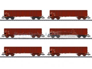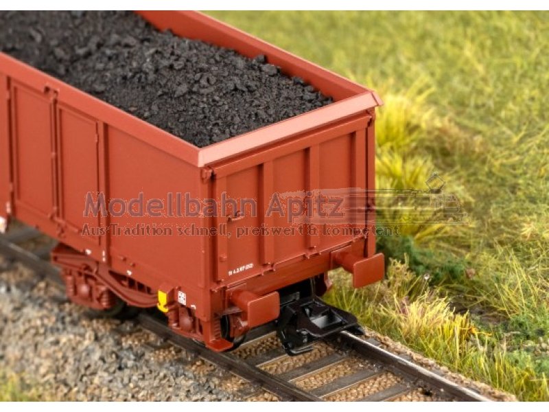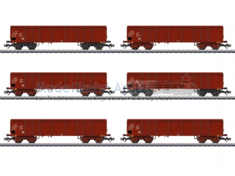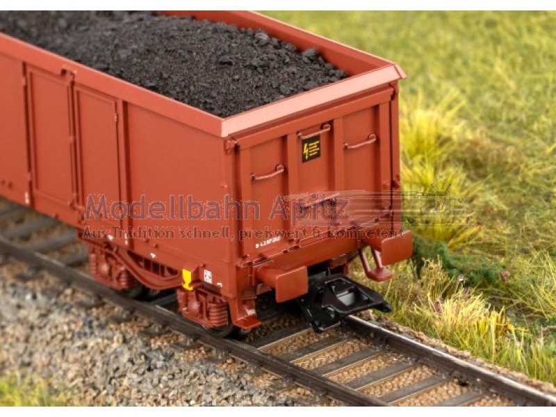 Vorbild: Sechs offene Güterwagen der Bauart Eas 5949 und 5971 der Deutschen Reichsbahn (DR). Modell: Vorbildgerechte Nachbildung der Stirnseiten. Die Stirntüren sind im Modell nicht zu öffnen. Separat angesetzte Tritte am Wagenboden. Alle Wagen beladen mit einer Braunkohle-Nachbildung. Alle Wagen mit unterschiedlichen Betriebsnummern. Alle Wagen einzeln verpackt.Länge über Puffer je 16,1 cm. Gleichstromradsatz E700580.