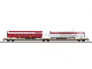Vorbild: 6-achsiger Doppel-Taschenwagen mit Gelenk der Bauart Sdggmrss (T3000e) der Hupac AG. Moderner Tragwagen für den kombinierten Ladungsverkehr. Ausführung mit vier seitlichen Klappriegeln. Betriebszustand ab 2019. Beladen mit zwei Gardinenplanen-Sattelaufliegern der Spedition Planzer. Modell: Beide Tragwagenhälften aus Metall, beweglich gelagert auf dem mittleren Drehgestell. Seitliche Klappriegel ab Werk montiert. Hochklappbar für den Transport von Containern oder Wechselbrücken. Viele separat angesetzte Details wie Tritte, Bremsleitungen und Haltestangen an den Wagenenden. Drehgestelle Bauart Y25. Pufferhöhe nach NEM. Halterungen für Königszapfen in hoher und niedriger Ausführung, Rangiertritte und Luftkessel für die Wagenenden liegen als separat ansteckbare Teile bei. Beladen mit zwei Gardinenplanen-Sattelaufliegern der Spedition Planzer. Länge über Puffer ca. 39,3 cm. Gleichstromradsatz E700580.