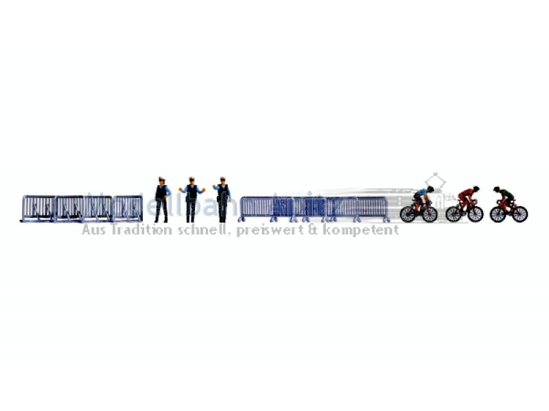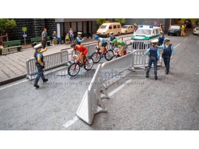 Inhalt: 3 Rennradfahrer, 3 Polizisten, 8 Absperrungen