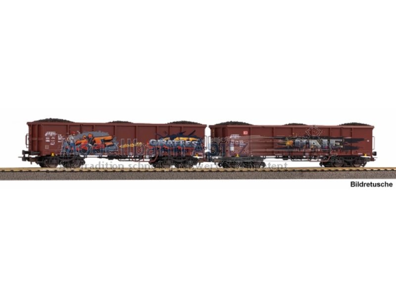 Neuheit 2026: Zweiteiliges Set Offener Güterwagen Typ Eaos der DB AG im Graffiti-Design mit Kohleladung für H0 Modelleisenbahn Epoche VIDas zweiteilige Wagenset bestehend aus zwei offenen Güterwagen vom Typ Eaos der DB AG zeigt den modernen Güterverkehr der Epoche VI in besonders auffälliger Gestaltung. Die Wagen überzeugen durch plastische Gravuren, fein ausgearbeitete Y25-Drehgestelle und eine authentische Graffiti-Lackierung mit konturenscharfer Bedruckung. Eine realistische Kohleladung, der detaillierte Stahlwagenboden sowie die Kulissenführung sorgen für ein vorbildnahes Erscheinungsbild und ausgezeichnete Laufeigenschaften im Zugverband.Zweiteiliges Eaos-Wagenset der DB AG in Epoche VI | Hochwertiges H0-Modell für die Modelleisenbahn | Auffälliges Graffiti-Design mit präziser Bedruckung | Realistische Kohleladung für authentischen Güterverkehr | Fein gravierte Y25-Drehgestelle für perfekte Gleislage | Kulissenführung für vorbildgerechte Wagenabstände