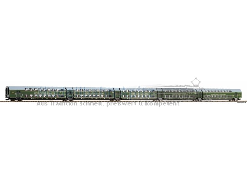 Neuheit 2026: Druckvariante des fünfteiligen Doppelstock-Gliederzuges in der Ausführung der Deutschen Reichsbahn in Epoche III mit Schriftzug Express Junger Sozialisten. Durch die glasklaren, bündig eingesetzten Fenster fällt der Blick auf die detaillierte Inneneinrichtung. Abgerundet wird der attraktive äußere Eindruck durch separat angesetzte Hand- und Griffstangen, plastisch anmutende Gravuren und eine konturenscharfe Bedruckung.