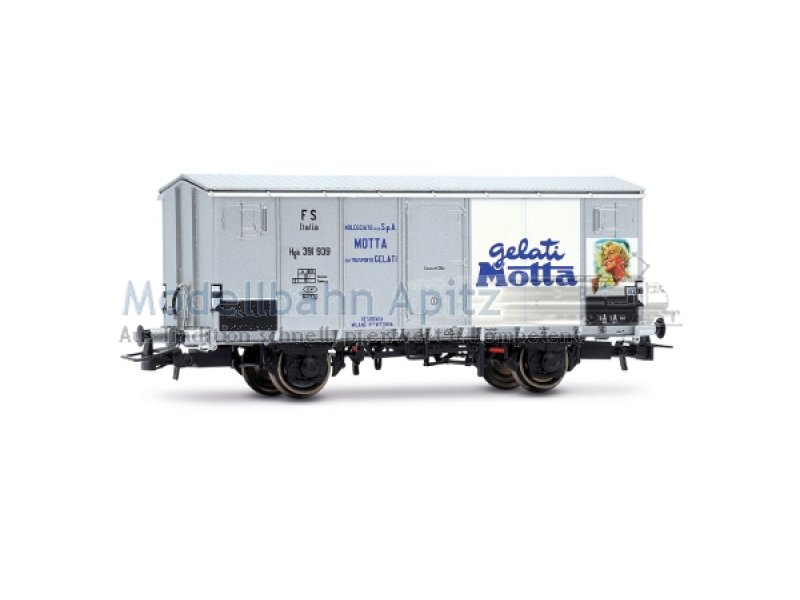 FS, 2-achs. Kühlwagen Hgb, Metallaufbau, silberne Farbgebung äGelati Motta“