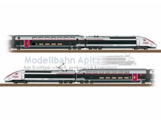 Die Grundgarnitur 22482 ist mit den Ergänzungswagen-Sets 23187, 23188 und 23189 auf eine vorbildgerechte 10-teilige Einheit erweiterbar.SNCF und TGV sind eingetragene Handelsmarken der SNCF. TGV® ist Eigentum der SNCF. Jedes Recht auf Vervielfältigung wird vorbehalten.
