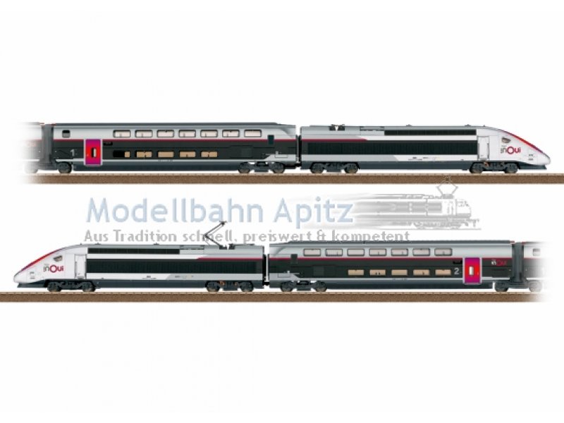 Vorbild: Hochgeschwindigkeitszug TGV INOUI (Euroduplex). Premium-Angebot der Französischen Staatsbahnen (SNCF), mit mehr Komfort und Service, wie z.B. WLAN. Ausführung für den Verkehr zwischen Paris und München. 2 Triebköpfe (M1 und M2), 1 Doppelstock-Übergangswagen (R1) 1. Klasse, 1 Doppelstock-Übergangswagen (R8) 2. Klasse. Triebzugnummer 4713. Aktueller Betriebszustand 2025. Modell: 4-teilige Grundgarnitur. Beide Triebköpfe (M1 und M2) motorisiert. Mit Digital-Decoder und umfangreichen Geräuschfunktionen. Geregelter Hochleistungsantrieb in beiden Triebköpfen, zentral eingebaut. Jeweils 4 Achsen über Kardan angetrieben. Haftreifen. Serienmäßig eingebaute Innenbeleuchtung. Fahrtrichtungsabhängig wechselndes Dreilicht-Spitzensignal, 2 rote Schlusslichter und Innenbeleuchtung konventionell in Betrieb, digital schaltbar. Drittes Spitzenlicht für französischen Lichtwechsel digital separat abschaltbar (Lichtfunktion). Beleuchtung mit wartungsfreien warmweißen und roten Leuchtdioden (LED). Mit Pufferspeicher. Führerstände in den Triebköpfen mit Inneneinrichtung. Separat angesetzte Griffstangen aus Metall. Triebkopf und Übergangswagen sind paarweise fest miteinander gekuppelt, mit Spezial-Kurzkupplungen und Kulissenführung. Zusätzliche Kulissenführung im Jakobs-Drehgestell. Fahrtrichtungsabhängige Stromversorgung über den jeweils vorderen Triebkopf. Innenbeleuchtung wird versorgt über die durchgehende elektrische Verbindung des ganzen Zuges. Jeder Triebkopf mit 2 Einholm-Stromabnehmer in unterschiedlichen Ausführungen mit jeweils einer Wippe für DB und SNCF. Stromabnehmer sind nur mechanisch, nicht elektrisch funktionsfähig. Maßstäbliche Nachbildung, daher befahrbarer Gleisbogen ab Mindestradius 360 mm bei freiem Lichtraum. Länge der 4-teiligen Grundgarnitur 102 cm.