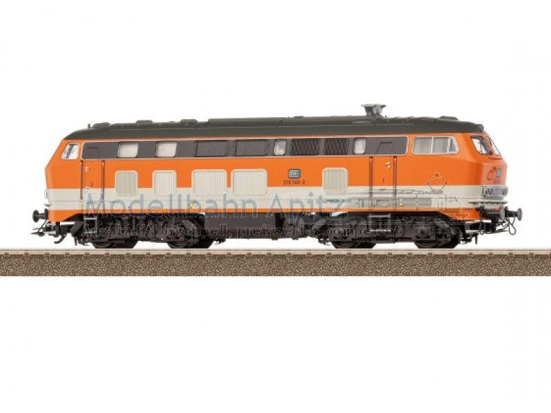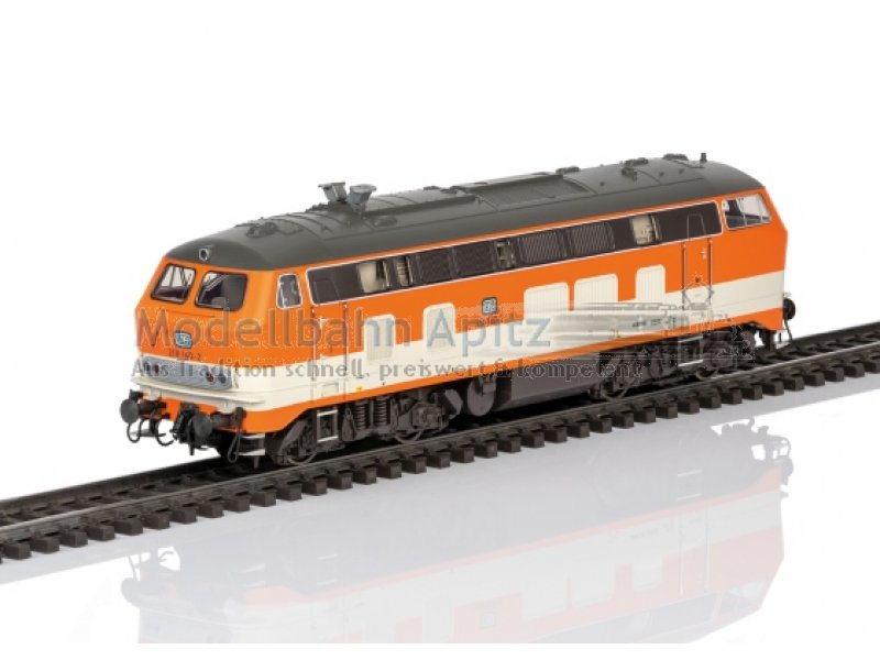 Vorbild: Diesellokomotive Baureihe 218 der Deutschen Bundesbahn. Reinorange/Kieselgraue Grundfarbgebung. Betriebsnummer 218 140-2. Betriebszustand ab 1985.
