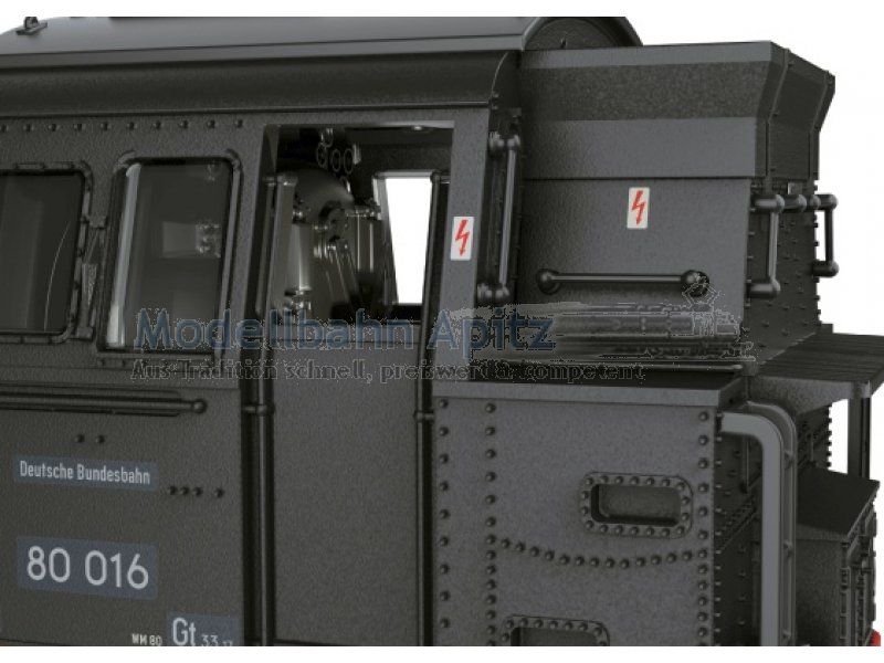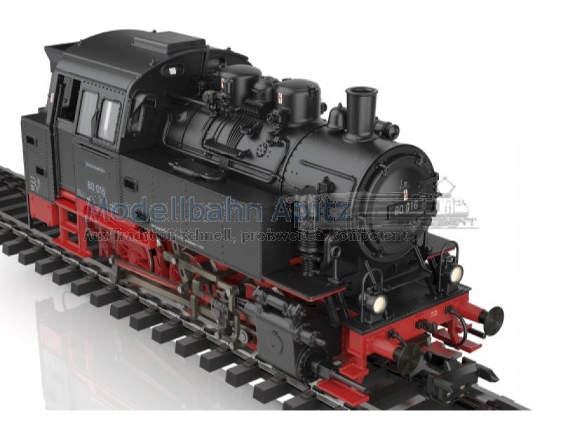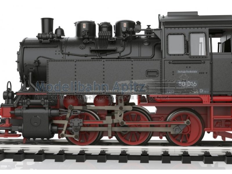 Vorbild: Tenderlokomotive Baureihe 80 der Deutschen Bundesbahn. Ausführung mit drei Kesselaufbauten, Läutewerk und Turbodynamo links, Rauchkammertüre ohne Zentralverschluss mit Nummernschild mittig. Tiefschwarze Grundfarbgebung. Betriebsnummer 80 016. Betriebszustand um 1953. Modell: Mit Digital-Decoder und umfangreichen Geräuschfunktionen. Geregelter Hochleistungsantrieb mit Schwungmasse im Kessel. Drei Achsen angetrieben. Haftreifen. Lokomotive weitgehend aus Metall. Serienmäßig eingebauter Rauchsatz. Fahrtrichtungsabhängig wechselndes Zweilicht-Spitzensignal und Rauchsatzkontakt konventionell in Betrieb, digital schaltbar. Beleuchtung mit wartungsfreien warmweißen Leuchtdioden (LED). Mit Pufferspeicher. Telex-Kupplung vorne und hinten jeweils separat digital schaltbar. Zahlreiche angesetzte Griffstangen und Leitungen. Pufferhöhe nach NEM. Bremsleitungen liegen als separat ansteckbare Teile bei.Länge über Puffer 11,1 cm.