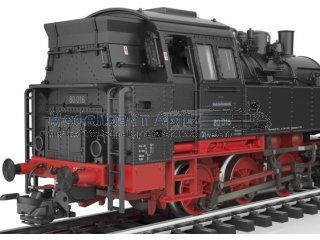 Vorbild: Tenderlokomotive Baureihe 80 der Deutschen Bundesbahn. Ausführung mit drei Kesselaufbauten, Läutewerk und Turbodynamo links, Rauchkammertüre ohne Zentralverschluss mit Nummernschild mittig. Tiefschwarze Grundfarbgebung. Betriebsnummer 80 016. Betriebszustand um 1953.