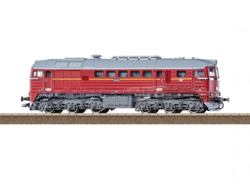 Vorbild: Diesellokomotive BR 120 der Deutschen Reichsbahn (DR), auch bekannt unter dem Spitznamen äTaigatrommel“. Ausführung mit Schalldämpfer sowjetischer Bauart. Betriebszustand 1973. Betriebsnummer 120 323. Modell: Mit Digital-Decoder und umfangreichen Geräuschfunktionen. Geregelter Hochleistungsantrieb zentral eingebaut. Jeweils zwei Achsen in jedem Drehgestell über Kardan angetrieben. Haftreifen. Fahrtrichtungsabhängig wechselndes Dreilicht-Spitzensignal und 2 rote Schlusslichter konventionell in Betrieb, digital schaltbar. Spitzensignal an Lokseite 2 und 1 jeweils separat digital abschaltbar. Wenn Spitzensignal an beiden Lokseiten abgeschaltet ist, dann beidseitig Funktion des Doppel-A-Lichts. Führerstandbeleuchtung mit der Fahrtrichtung wechselnd, digital schaltbar. Maschinenraumbeleuchtung digital schaltbar. Beleuchtung mit wartungsfreien warmweißen und roten Leuchtdioden (LED). Seitlich angesetzte Griffstangen aus Metall. Frontschürze gegen geschlossene Frontschürzen austauschbar. Länge über Puffer ca. 20,2 cm.