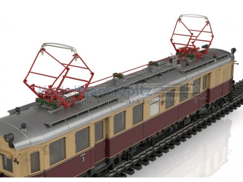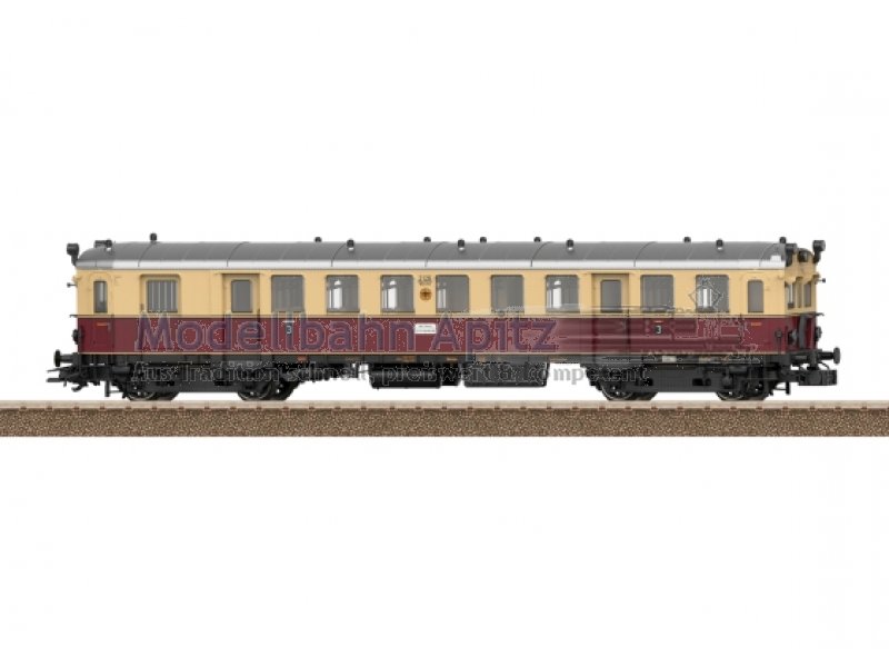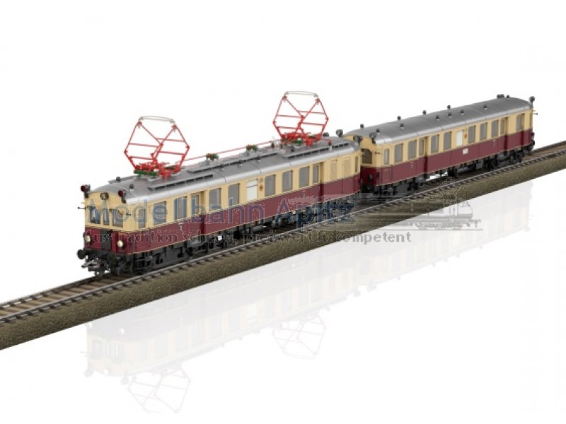 Vorbild: Elektrischer Triebwagen elT mit Steuerwagen elS der Deutschen Reichsbahn-Gesellschaft (DRG). Ausführung mit Fronttüren am Triebwagen und Steuerwagen mit stirnseitigen Übergangsblechen. Oben angebrachte Zugschlusssignal-Laternen. Anordnung der Sandkästen im Ablieferungszustand. Farbgebung in beige/weinrot. Betriebsnummern elT 1126 und elS 2126. Steuerwagen elS mit Laufschild äNach Ismaning - Nach München Ost Pbf“. Heimatbahnhof München. Betriebszustand 1932. Modell: Triebwagen elT als angetriebene Einheit mit Digital-Decoder und umfangreichen Geräuschfunktionen. Geregelter Hochleistungsantrieb. Vier Achsen angetrieben. Haftreifen. Zweilicht-Spitzensignal und zwei rote Schlusslichter über beide Einheiten an den äußeren Stirnseiten mit der Fahrtrichtung wechselnd, digital schaltbar. Zusätzlich 3. Spitzenlicht oben als Zugbegegnungslicht jeweils in Fahrtrichtung vorne separat digital schaltbar. Beide Einheiten sind über eine mehrpolige Kupplung fest miteinander Gekuppelt. Innenbeleuchtungen im Triebwagen elT und Steuerwagen elS konventionell in Betrieb, digital schaltbar. Beleuchtung mit wartungsfreien warmweißen Leuchtdioden (LED). Spitzensignal an Triebwagenseite 1 und Steuerwagenseite 2 jeweils separat digital abschaltbar. Führerstandbeleuchtung an den äußeren Führerständen separat digital schaltbar.Mit Pufferspeicher. Sehr detaillierte Ausführung von Fahrwerk und Aufbau. Wagenkasten und Wagenboden aus Metall. Mehrteilige und mehrfarbige Inneneinrichtung. Nachgebildete Glocke, Bremsleitungen und zwei Kurzkupplungsköpfe liegen bei. Gesamtlänge über Puffer ca. 46,8 cm.