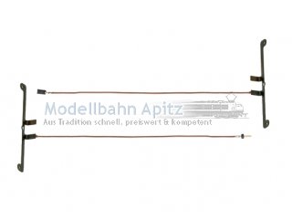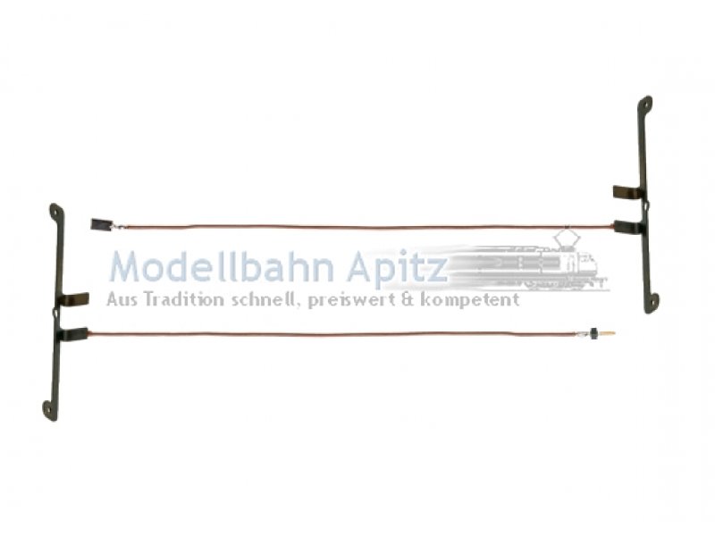 Stromzuführung für die Nachrüst-Innenbeleuchtungen 73410 und 73411, bestehend aus einem Achslager mit angelötetem Kabel und Buchse sowie einem Achslager mit angelötetem Kabel und Stecker für den elektrischen Anschluss. Verwendbar für die vierachsigen Schnellzugwagen der Einheitsbauart 1928 bis 1930, mit symmetrischen Drehgestell-Befestigungen.