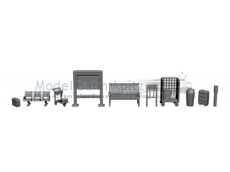 3D-Kit “Bahnhof & Bahnsteigö , Inhalt: 1 Bank, 3 Mülleimer, 4 Gepäck-Trolleys, 6 Koffer, 1 Zugstands-/ Fahrplan-Anzeigetafel, 1 Gitterwagen, 3 Ticket… |
