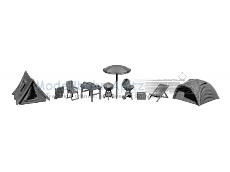 3D-Kit “Beim Campingö , Inhalt: 2 Zelte, 1 Sonnenschirm, 1 Tisch, 4 Grills, 2 Bierkästen, 8 Klappstühle |