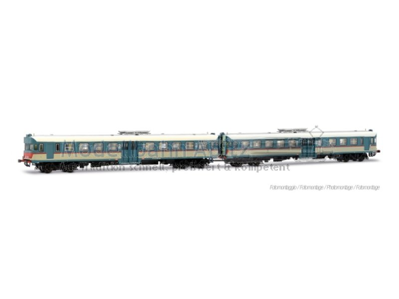 FS, 2-tlg. Set Dieseltriebwagen der Reihe ALn 668 1200 (1 Doppeltür, Auspuffrohre), in Ursprungslackierung mit flachen Fenstern