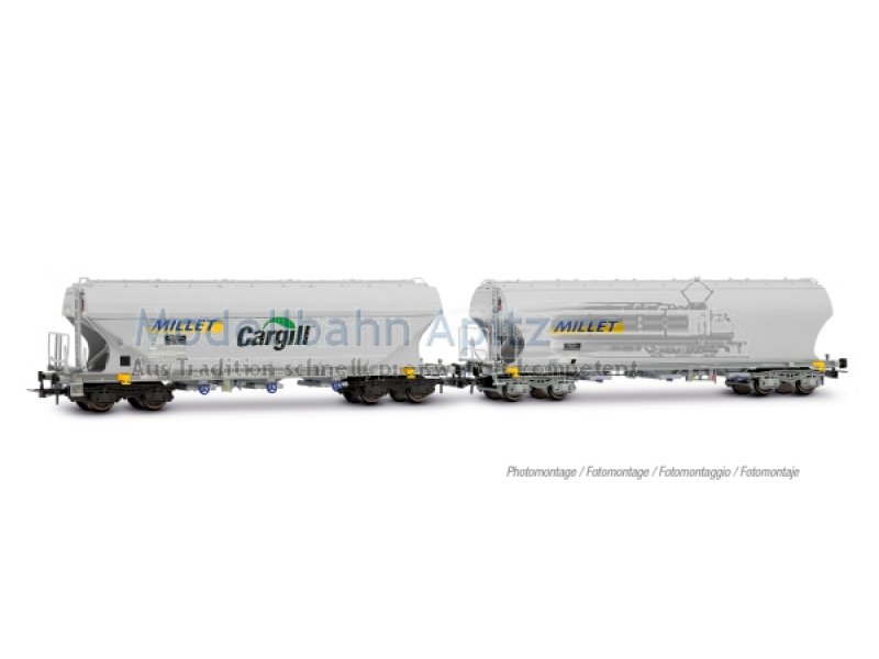 SNCF, 2-tlg. Set 4-achs. Getreidesilowagen äMILLETö, gerade und runde Seitenwände, graue Farbgebung