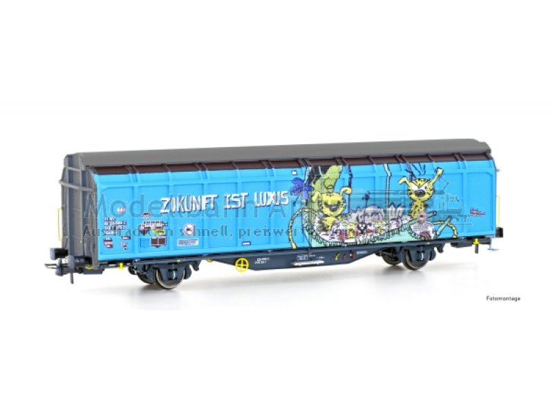 Sehr zum Ärger der Bahn werden jedes Jahr tausende Wagen und Triebfahrzeuge mit Graffitis überzogen – allerdings muss man aber auch zugeben, finden sich immer wieder auch Motive, die zum Schmunzeln oder auch Nachdenken anregen. Mit einer Serie von großflächigen Motiven sind zahlreiche Schiebewandwagen der Bauart Hbbillns der SBB verziert worden. Mit der Serie äZukunft ist Luxus“ entstanden verschiedene Motive rund um den Kapitalismus, Flüchtlingskrise und sogenannten First World Problems. Beim Besprühen der äWholecars“ werden bewusst alle Anschriftenfelder vom Künstler frei gelassen, damit steigt nämlich die Chance, dass das Graffiti nicht entfernt wird. Jeder Schiebewandwagen ist von beiden Seiten absolut authentisch und vorbildgetreu bedruckt.