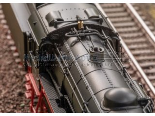 Modell: Mit Digital-Decoder und umfangreichen Geräuschfunktionen. Geregelter Hochleistungsantrieb mit Schwungmasse im Kessel. 4 Achsen angetrieben. Haftreifen. Lokomotive und Tender weitgehend aus Metall. Serienmäßig eingebauter Raucheinsatz, mit geschwindigkeitsabhängigem, dynamischem Rauchausstoß. Fahrtrichtungsabhängig wechselndes Zweilicht-Spitzensignal konventionell in Betrieb, digital schaltbar. Führerstandbeleuchtung und Feuerbüchsenflackern jeweils separat digital schaltbar. Beleuchtung mit wartungsfreien warmweißen und roten Leuchtdioden (LED). Mit Pufferspeicher. Schwenkbare Führerstandtüren und Imitation der Vorhänge zwischen Führerstand und Tender. Kurzkupplung mit Kinematik zwischen Lok und Tender. Am Tender kinematikgeführte Kurzkupplung mit NEM-Schacht. Pufferhöhe an Lok und Tender nach NEM. Befahrbarer Mindestradius R2 437,5 mm. Kolbenstangenschutzrohre und Bremsschläuche liegen bei. Länge über Puffer 26,0 cm.