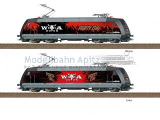 Vorbild: Schnellzuglokomotive Baureihe 101 mit einer Werbegestaltung zum Wacken Open Air (W:O:A®). Betriebszustand 2026. Modell: Mit Digital-Decoder und umfangreichen Geräuschfunktionen. Geregelter Hochleistungsantrieb. 4 Achsen angetrieben. Haftreifen. Fahrtrichtungsabhängig wechselndes Dreilicht-Spitzensignal und 2 rote Schlusslichter konventionell in Betrieb, digital schaltbar. Fernscheinwerfer separat schaltbar. Führerstandbeleuchtung digital schaltbar. Spitzenlicht an Lokseite 2 und 1 jeweils separat digital abschaltbar. Wenn Spitzensignal an beiden Lokseiten abgeschaltet ist, dann beidseitige Funktion des Doppel-A-Lichts. Beleuchtung mit wartungsfreien warmweißen und roten Leuchtdioden (LED). Mit Pufferspeicher zur Überbrückung von kurzen stromlosen Stellen. Kulissengeführte Kupplung. Länge über Puffer 21,9 cm.