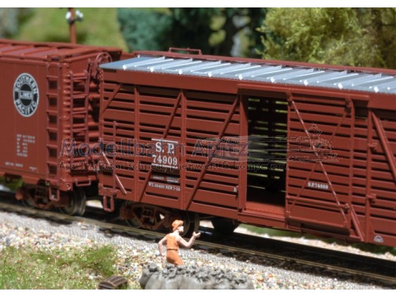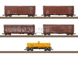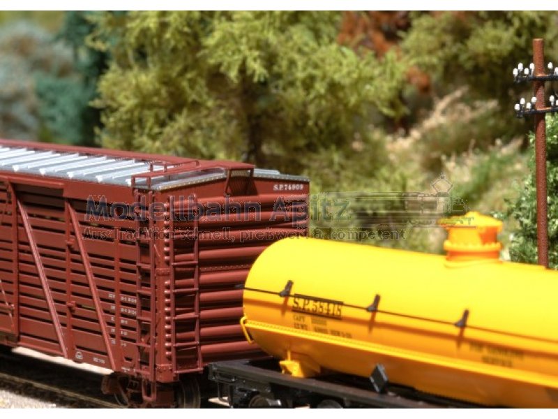Vorbild: Set bestehend aus fünf US-Güterwagen unterschiedlicher Bauarten der Southern Pacific. Drei Single-Door Boxcars, ein Stockcar (Viehwagen) und ein Tankcar. Betriebszustand um 1948. Modell: Rahmen und Boden aus Metall. Detaillierte Drehgestelle mit Spezialradsätzen. Boxcars und Stockcar mit Schiebetüren zum Öffnen. Dachlaufstege, Aufstiegsleitern, Bremsanlage und weitere Details separat angesetzt. Kupplungen austauschbar. Alle Wagen einzeln verpackt in zusätzlicher Umverpackung. Gesamtlänge über Kupplungen ca. 76 cm. Wechselstromradsatz: E320551.Gleichstromradsatz E320389 (RP25).