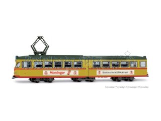 Straßenbahn Duewag GT6, zwei Frontlampen, äVBK Karlsruhe – Moninger-Bier“ |