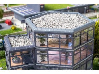 Moderner Bürokomplex mit Charakter! Dieser vierstöckige Bürobau überzeugt mit seiner futuristischen sechseckigen Grundform. Komplett verglast und mit einem dreistöckigen Treppenhaus ergänzt, wirkt die Architektur offen und leicht. Das unterste Stockwerk aus grauen Ziegelsteinen setzt mit seiner Maueroptik einen markanten Kontrast. Perfekt geeignet für jede moderne Stadtlandschaft im Modell.