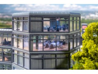 Moderner Bürokomplex mit Charakter! Dieser vierstöckige Bürobau überzeugt mit seiner futuristischen sechseckigen Grundform. Komplett verglast und mit einem dreistöckigen Treppenhaus ergänzt, wirkt die Architektur offen und leicht. Das unterste Stockwerk aus grauen Ziegelsteinen setzt mit seiner Maueroptik einen markanten Kontrast. Perfekt geeignet für jede moderne Stadtlandschaft im Modell.