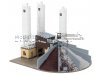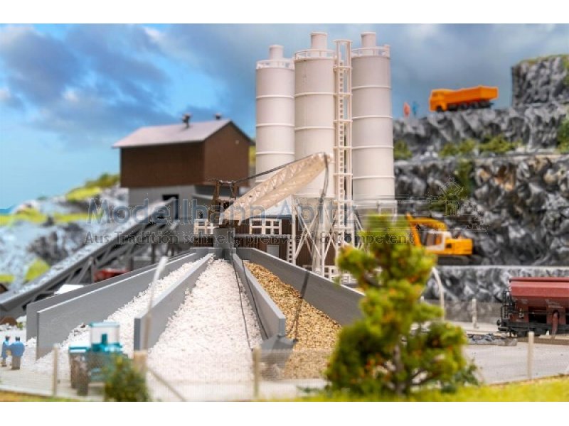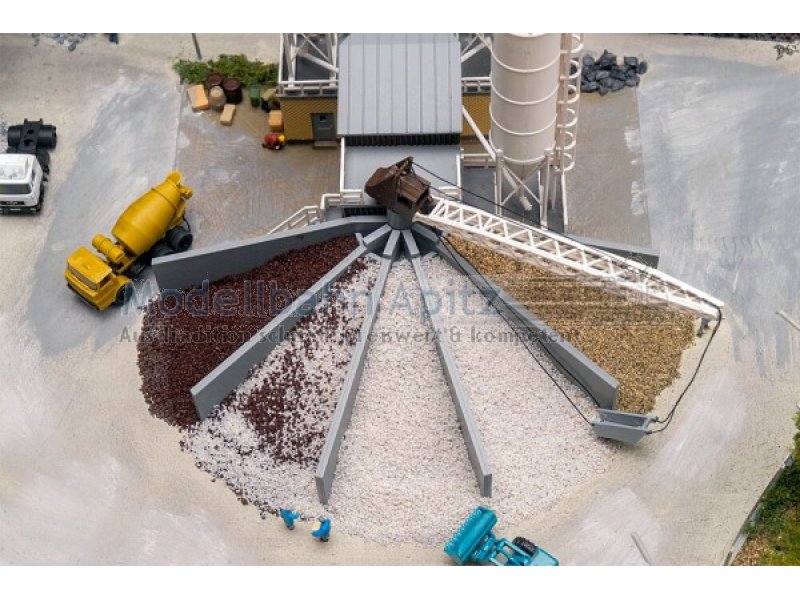 Im Betonmischwerk herrscht Hochbetrieb! Eine beeindruckende Mischanlage mit 3 Hochsiloreihen und einem Bürogebäude bildet das Zentrum. Eine Durchfahrt bietet den LKW die Möglichkeit, schnell beladen zu werden. Die Sandbunkertaschen sind für unterschiedliches Sand- und Kiesgut unterteilt und Sand in 3 verschiedenen Farben zur Ausgestaltung der Sandbuchten ist ebenfalls enthalten. Eine Kranvorrichtung und ein Kies-Verladesilo mit Förderband (ohne Funktion) liegen ebenfalls bei und ergänzen die Szenerie.