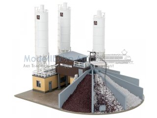 Im Betonmischwerk herrscht Hochbetrieb! Eine beeindruckende Mischanlage mit 3 Hochsiloreihen und einem Bürogebäude bildet das Zentrum. Eine Durchfahrt bietet den LKW die Möglichkeit, schnell beladen zu werden. Die Sandbunkertaschen sind für unterschiedliches Sand- und Kiesgut unterteilt und Sand in 3 verschiedenen Farben zur Ausgestaltung der Sandbuchten ist ebenfalls enthalten. Eine Kranvorrichtung und ein Kies-Verladesilo mit Förderband (ohne Funktion) liegen ebenfalls bei und ergänzen die Szenerie.
