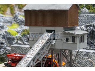 Im Betonmischwerk herrscht Hochbetrieb! Eine beeindruckende Mischanlage mit 3 Hochsiloreihen und einem Bürogebäude bildet das Zentrum. Eine Durchfahrt bietet den LKW die Möglichkeit, schnell beladen zu werden. Die Sandbunkertaschen sind für unterschiedliches Sand- und Kiesgut unterteilt und Sand in 3 verschiedenen Farben zur Ausgestaltung der Sandbuchten ist ebenfalls enthalten. Eine Kranvorrichtung und ein Kies-Verladesilo mit Förderband (ohne Funktion) liegen ebenfalls bei und ergänzen die Szenerie.
